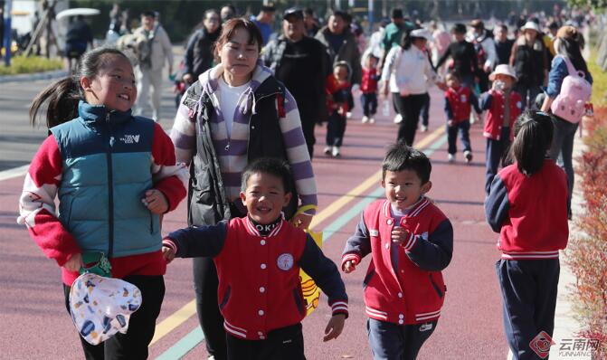 家長和孩子們參加親子健身活動,讓滇池綠道健身步道一派歡騰。