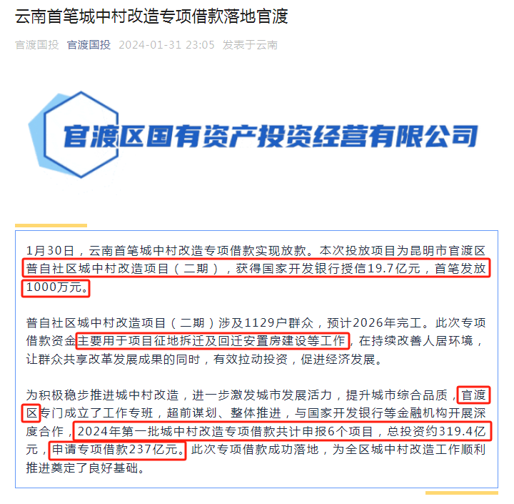 昨晚,官渡區(qū)國投微信公眾號發(fā)布消息,云南首筆城中村改造專項借款落地官渡,普自村城改二期獲得國家開發(fā)銀行授信19.7億元,首筆已發(fā)放1000萬元,改造預(yù)計2026年完工。