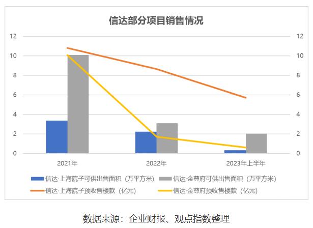 2022年財報披露,信達·上海院子預售比例達到了97%,同年可供銷售的面積為2.23萬平方米,已預售面積為1.9萬平方米,預收售樓款及結轉收入分別為8.64億元、27.7億元。