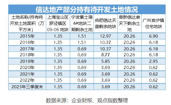 財報數據透露,上海寶山區羅涇鎮區09-06地塊、阜新信達泉天下剩余土地從2015年至今始終未見減少;合肥信達天御剩余地塊于2015年持有待開發面積為12.97萬平方米,直至2023年三季度末仍剩余3.69萬平方米。