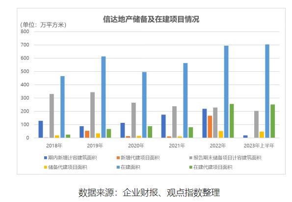 2023年上半年,信達地產儲備項目計容建筑面積為205.12萬平方米,其中儲備代建項目面積達到49.25萬平方米,比例進一步上升至24.01%。同期,該公司在建代建項目面積達到251.43萬平方米。