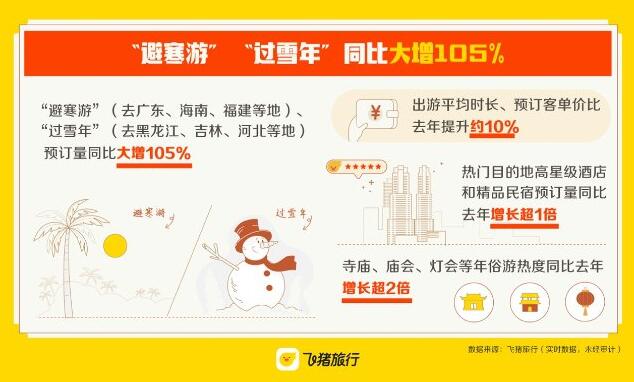 值得一提的是,春節(jié)假期出游品質化趨勢更加明顯。飛豬數(shù)據(jù)顯示,今年春節(jié)假期出游平均時長、預訂客單價在去年基礎上提升約10%。數(shù)據(jù)顯示,中長線游預訂量同比去年增長超3倍,其中自由行的平均旅行日期較去年提升了30%。包含租車、包車、接送等在內的用車服務預訂量同比去年增長近1倍,租車訂單中SUV車型占比近1/4,僅次于經濟型車輛,商務型、舒適型、豪華型車輛的占比也同比提升。此外,熱門目的地的高星級酒店和精品民宿預訂量同比去年增長超1倍。