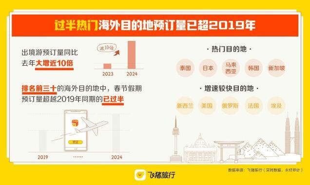 飛豬數(shù)據(jù)顯示,今年春節(jié)假期出境游預訂量創(chuàng)下近4年峰值,同比去年大增近10倍。排名前30的海外目的地中,春節(jié)假期預訂量超越2019年同期的已過半。出境游的距離也顯著拉長,出境游熱門目的地正由“4小時飛行圈”向“12小時飛行圈”拓展。