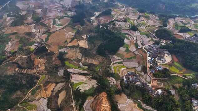 一座座青色或黃褐色的小田房點綴在層次分明的山水田園中,梯田如階梯般盤旋在山間水尾,與金黃的油菜花相映成趣,呈現出一幅原生態的美麗畫卷,讓人頓有“龍川江畔,梯田如畫”之感。