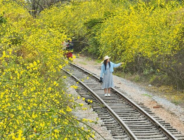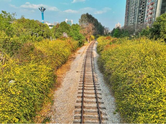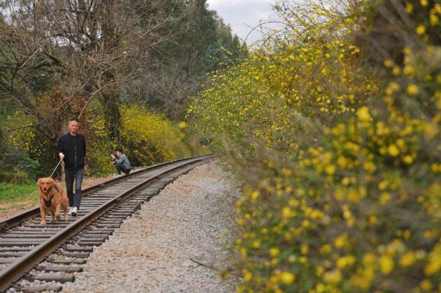 在歷史悠久的米軌鐵路旁,一叢叢迎春花怒放著,向過往的行人宣告著春天的到來。每當周末來臨,這片迎春花海成了昆明市民周末休閑的好去處。市民紛紛走出家門,來到這片被迎春花裝點的鐵路旁。人們在這里漫步,或是靜靜地坐在鐵軌邊,享受著春日的暖陽和花香,讓忙碌了一周的心情得到放松和愉悅。