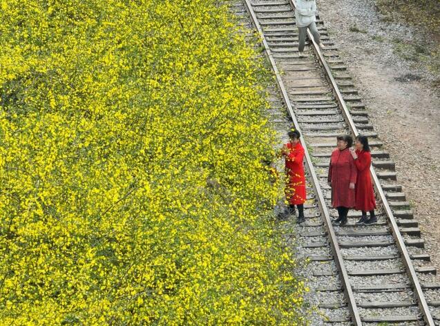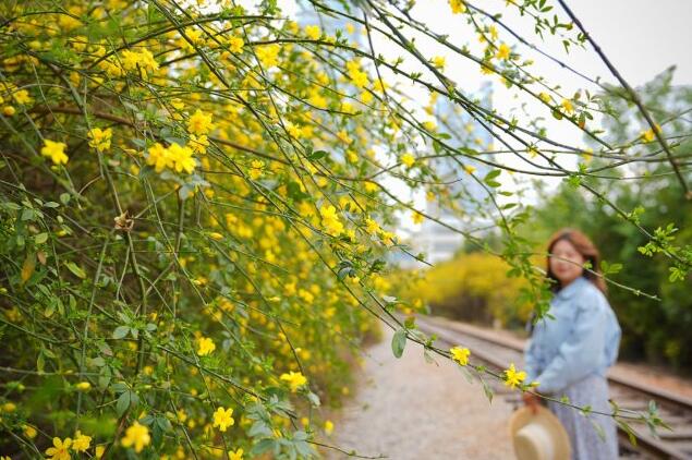 隨著春天的到來,昆明海源財富中心附近的米軌旁迎春花競相綻放,吸引了眾多市民前來賞花、拍照。