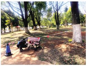 記者見到,其中一個座椅用錐桶和彩旗繩子圍了起來,正在粉刷油漆。正在給座椅刷漆的工人介紹,這是公園在對老舊座椅進行更換。“3天拆了40多個,因為之前的椅子有一些破損,可能有安全隱患,所以要把這些全部拆除換新。”
