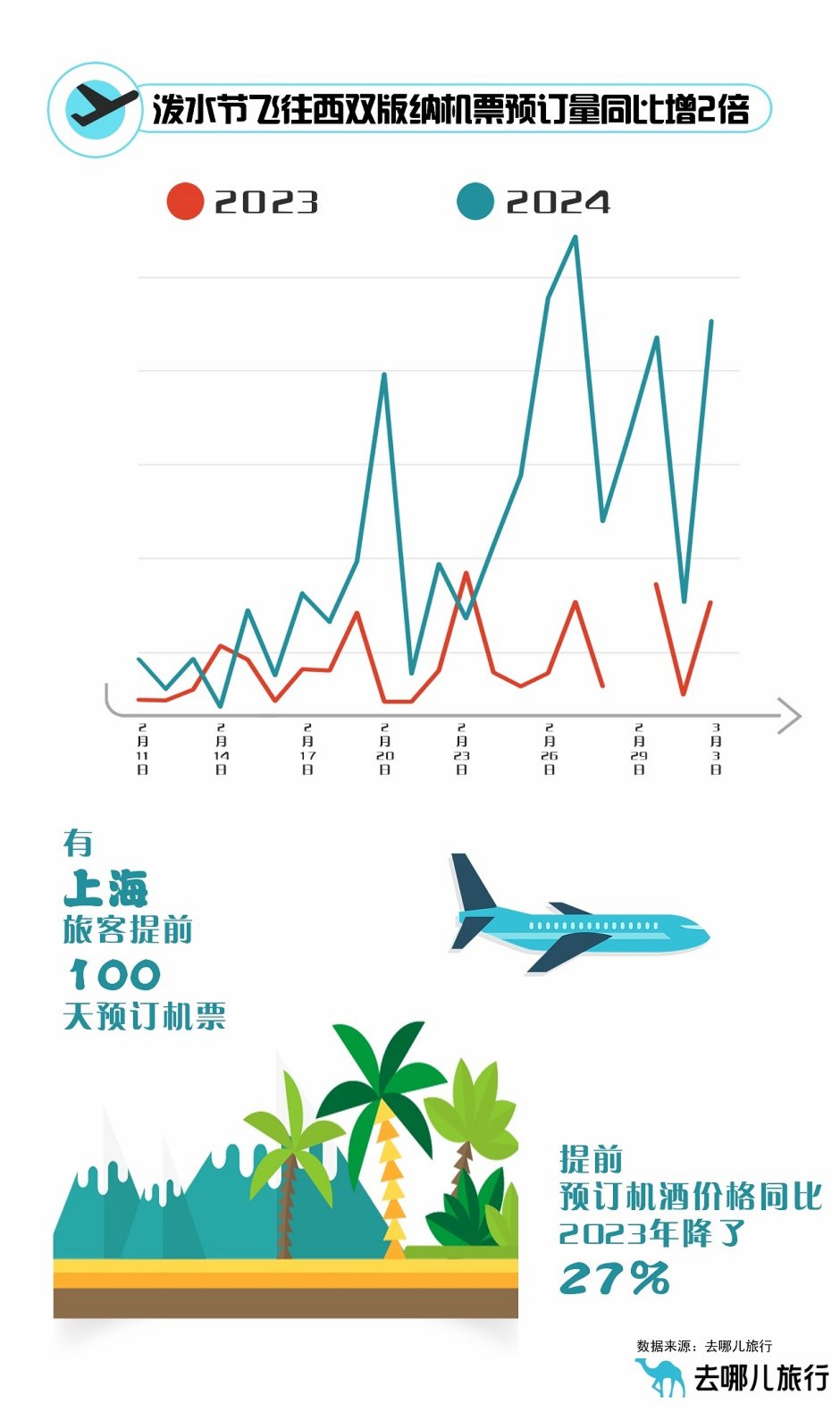 距離潑水節還有一個月時間,已有不少旅客提前預訂了飛往西雙版納的機票,截至3月5日,去哪兒數據顯示,預訂量同比增長2倍,省外客源地Top10為上海、重慶、杭州、長沙、廣州、北京、成都、南寧、南京、西安。預訂最早的旅客,提前100天購買了上海-西雙版納的機票。相較2023年3月,飛往西雙版納的航班更多,機票價格較2023年下降27%。價格方面,春城晚報-開屏新聞記者查詢獲悉,進入4月,上海直飛西雙版納裸票多在600~2000元之間;北京直飛西雙版納則在700~2000元之間。去哪兒大數據研究院研究員肖鵬表示:“好玩、有趣的節日正在成為旅游的風向標,特色活動帶動當地消費。”