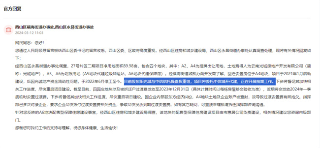 近日,有網友在人民網地方領導留言板上反映西山區城中村改造27號片區二期A6地塊安置問題。西山區福海街道辦事處,西山區永昌街道辦事處在答復中提到27號片區二期項目凈用地面積89.98畝,包含四個地塊,其中:A2、A4為掛牌出讓用地,土地競得人為云南光誠房地產開發有限公司(簡稱:光誠地產),也即陽光城檀境項目股東陽光城與中信信托操盤權重組,項目將委托中信城開代建,正在開展前期工作。