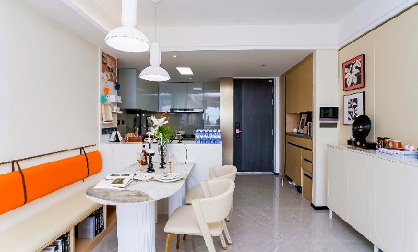 本次將原本的U型廚房改造成為開放式廚房 ,精巧布局,兼具互動(dòng)與社交屬性的廚房“味蕾”社交場(chǎng)。色彩搭配協(xié)調(diào)統(tǒng)一,暖暖的色調(diào),營造愛與美食相融的時(shí)光。