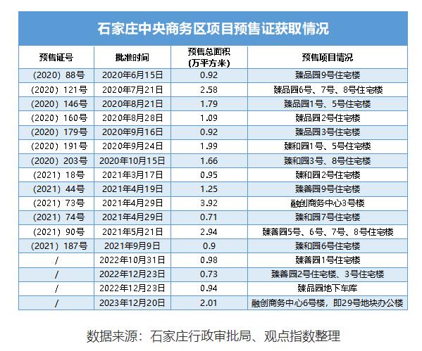 次年,石家莊中央商務區項目正式入市。其中,2020年6月15日,項目獲得首批預售許可證,預售總面積為0.92萬平方米,預售項目為臻品園9號住宅樓,同年,該公司共計拿到7張預售證,隨后2021年、2022年及2023年,該公司共計獲取17張預售許可證。