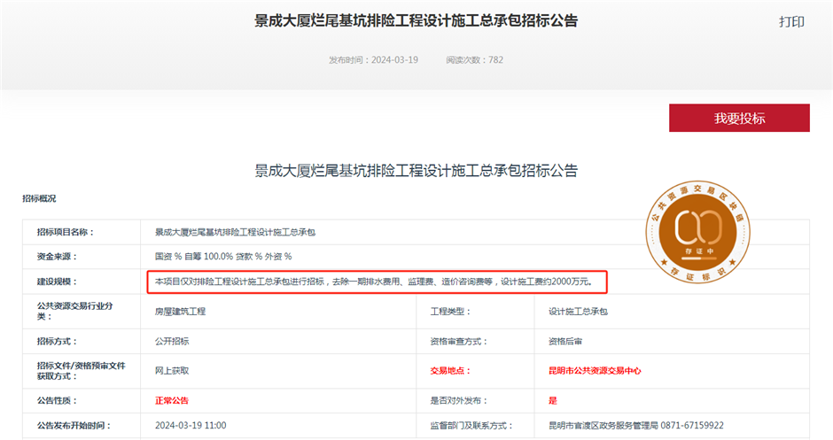3月19日,官渡區住建局正式發布了景成大廈爛尾基坑排險工程設計總承包招標公告。