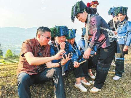 謝莫尼勒(左一)與哈尼族阿姨分享其拍攝的梯田照片。 本報記者 李吒 攝