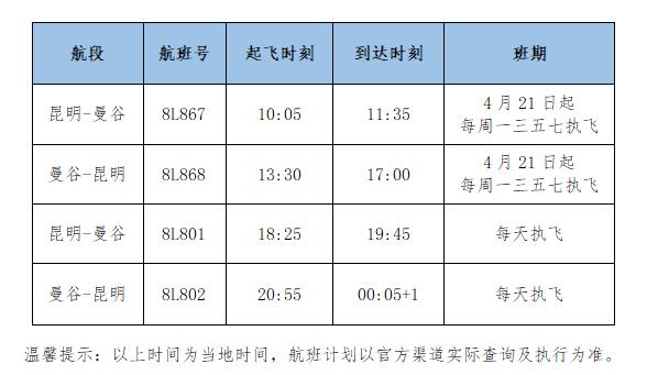 值得一提的是,目前昆明往返曼谷的航班大多集中在中午之后,祥鵬航空緊密結合市場需求進行航班加密,在現有每天一班的基礎上,計劃4月21日起新增每周一、三、五、七早班航班,屆時每周共將執飛11班。10時左右出發、17時左右落地的早班航班,將為兩國旅客出游提供更靈活的選擇以及預留更充裕的時間。另外,祥鵬航空還將于4月5日起正式復航成都天府往返曼谷航班,每周一三五七執飛。