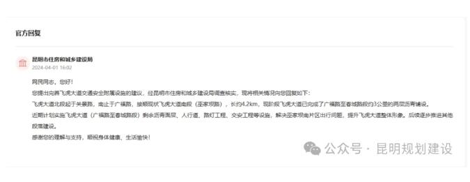 4月1日,昆明市住房和城鄉建設回復表示,飛虎大道北段起于關景路,南止于廣福路,接順現狀飛虎大道南段(巫家壩路),長約4.2km,現階段飛虎大道已完成了廣福路至春城路段約3公里的兩層瀝青鋪設。