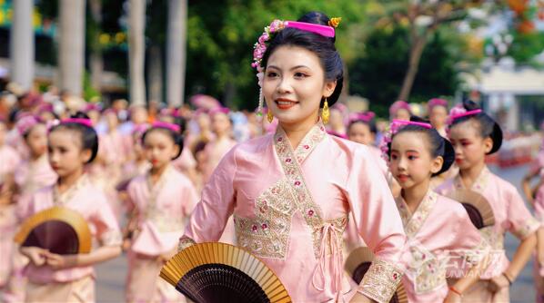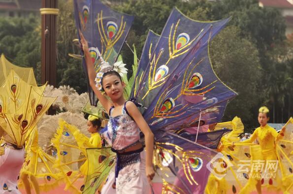 7個展演方陣、48支表演隊伍、19輛美輪美奐的花車經過景洪市主街道,最終抵達潑水廣場。演出隊伍一字排開,邊走邊演,一路上鑼鼓喧天,熱鬧非凡。