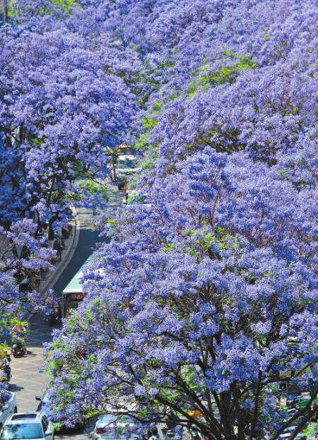 1984年,藍(lán)花楹首次由中國科學(xué)院昆明植物研究所從阿爾及利亞引進(jìn)昆明,開啟春城花事的另一種顏色。每年4月底至5月初,一公里多長的教場中路兩旁,串串藍(lán)紫色花朵競相怒放,觀者如云。