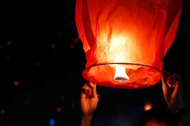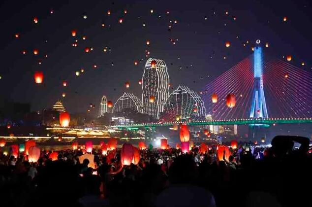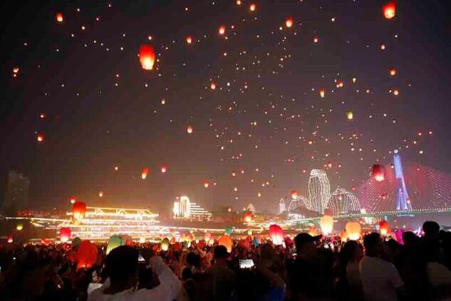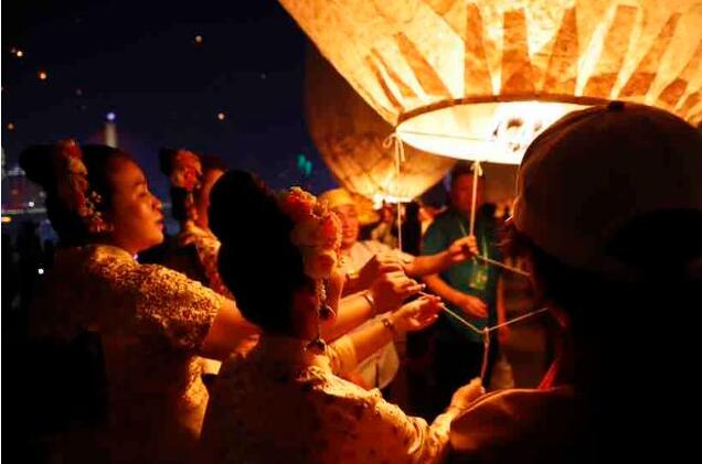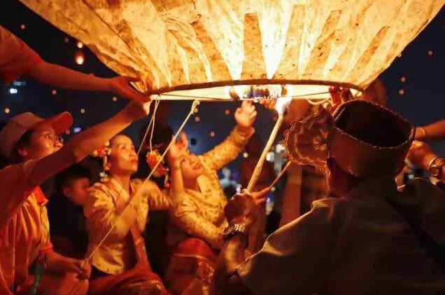 潑水節,傣語為“桑堪比邁”,是傣歷的新年。潑水節的第一天,是孔明燈之夜,傣族人民會聚到瀾滄江邊放飛孔明燈,許愿祈福。