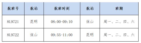 祥鵬航空昆明⇋保山航班班期為每周一、二、四、六。去程航班號8L9721,計劃8:00從昆明長水國際機場起飛,9:10到達保山云瑞機場;回程航班號8L9722,計劃9:55從保山云瑞機場起飛,11:00到達昆明長水國際機場。航班計劃以官方渠道實際查詢及執行為準。