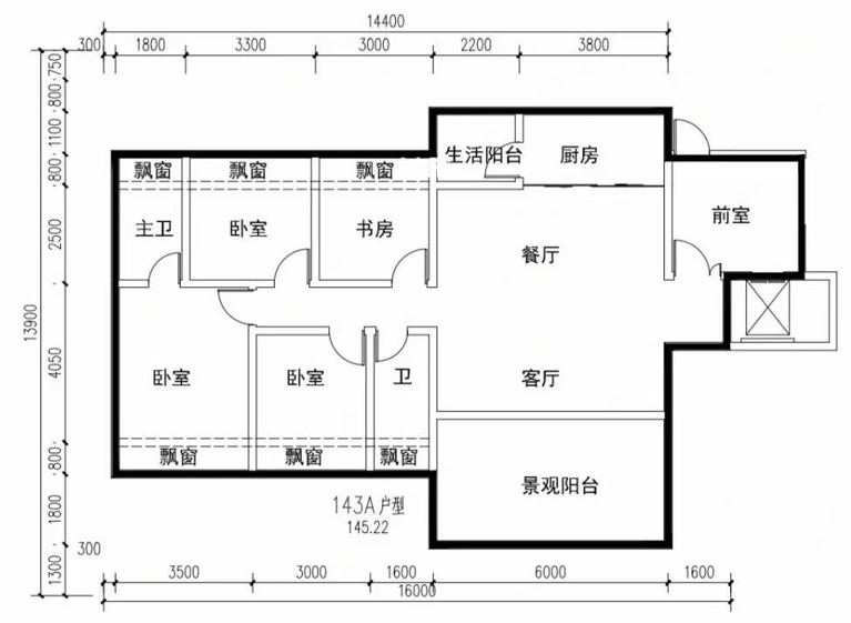 143平米四房?jī)尚l(wèi)戶型的陽(yáng)臺(tái),僅標(biāo)注了長(zhǎng)度為6米,寬度大致估算應(yīng)不少于3米,面積接近20平米,飄窗和獨(dú)立電梯廳也和169平米戶型差不多。