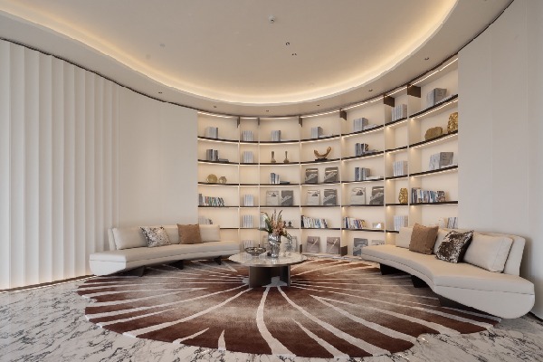 書吧內(nèi),潔白的家具,花瓣形式的地毯,整個區(qū)域整潔現(xiàn)代優(yōu)雅,沙發(fā)的形式宛若山峰被白雪覆蓋。進(jìn)一步與窗外蒼山呼應(yīng)。