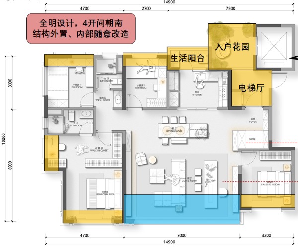 作為一梯一戶小高層產(chǎn)品,獨(dú)立電梯廳入戶,直連約8㎡的私享花園,三面采光,南北通透,四面朝南。