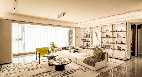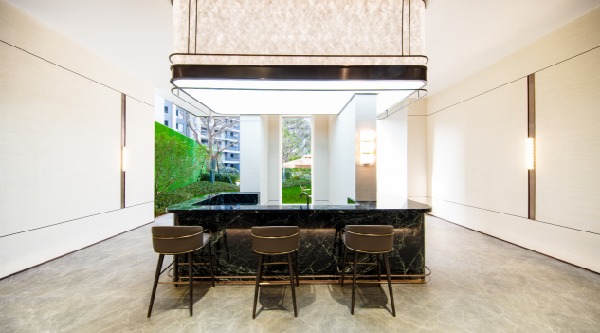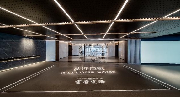 社區歸家體驗上,打造規制酒店式門庭,寬約31m、高約7.8m,全幕墻體系彰顯奢華氣質;地庫采用高端愛馬仕灰石材、星空頂設計及玻璃幕墻,地面為金剛砂固化劑工藝,細節之處盡顯品質;星級入戶大堂以雪山飛狐巖板背景墻,為業主營造出歸家的儀式感與尊貴感。