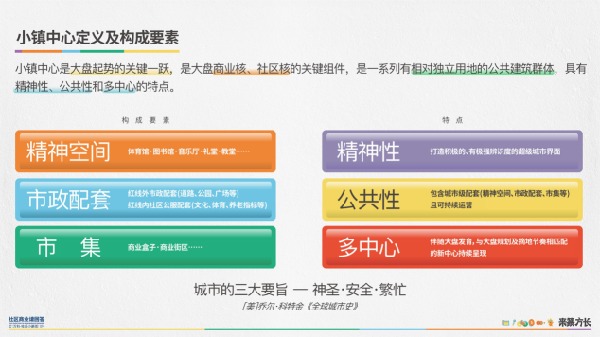 在萬科產(chǎn)品研發(fā)體系中,對“小鎮(zhèn)中心”研發(fā)制定專項(xiàng)導(dǎo)則:構(gòu)成要素需要有精神空間,市政配套,商業(yè)市集;空間特點(diǎn)上需有精神性,公共性,多中心。